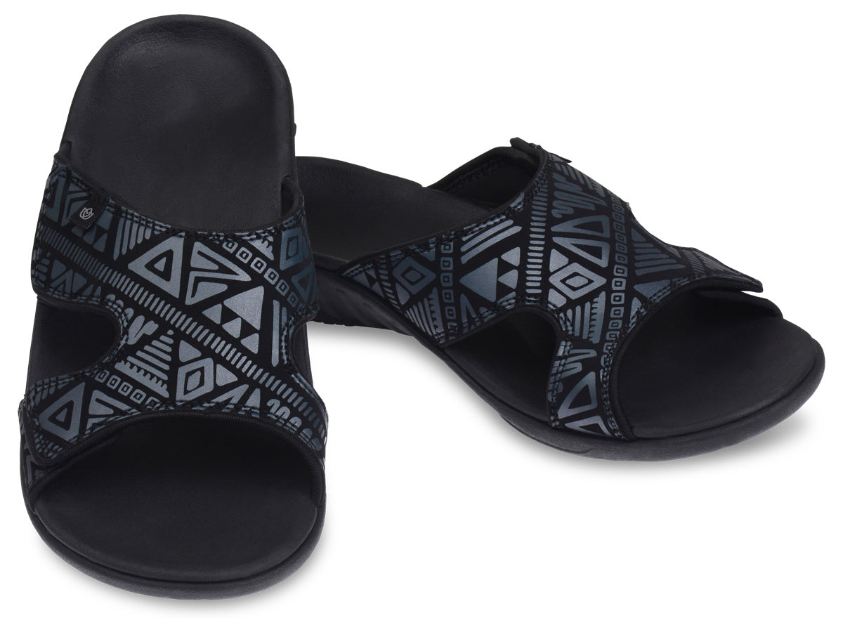 The Tribal slide combines a simple adjustable strap style and a printed PU material upper with a technically inspired footbed.