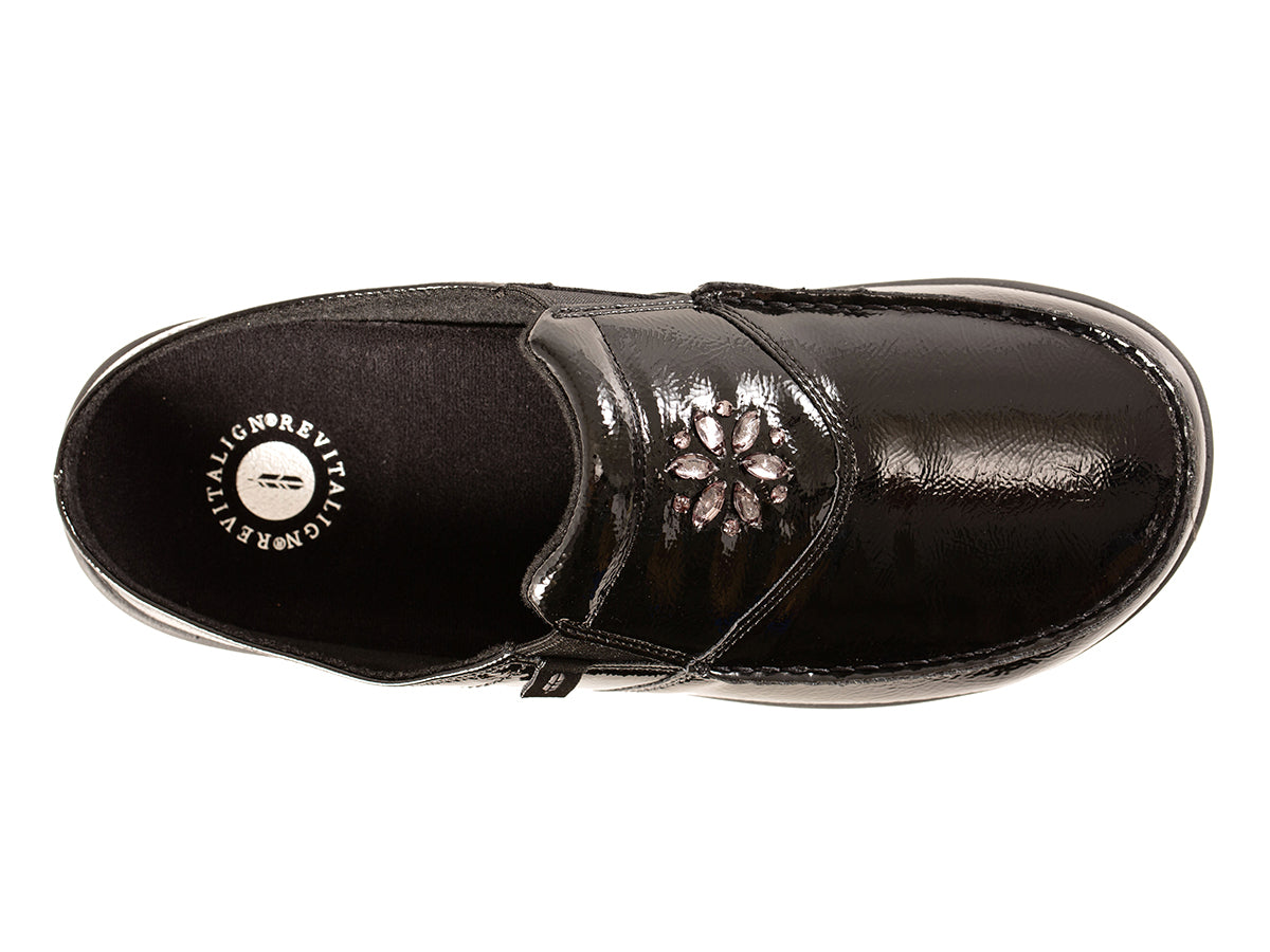 The Siesta Glitz brings a glamorous update to your everyday style with rich patent leather tones and sparkling bedazzled gems. Designed for both fashion and comfort, this shoe is perfect for staying stylish and comfortable all season long. With Revitalign® Footwear, you get lasting orthotic support and all-day wearability built right into the design.
