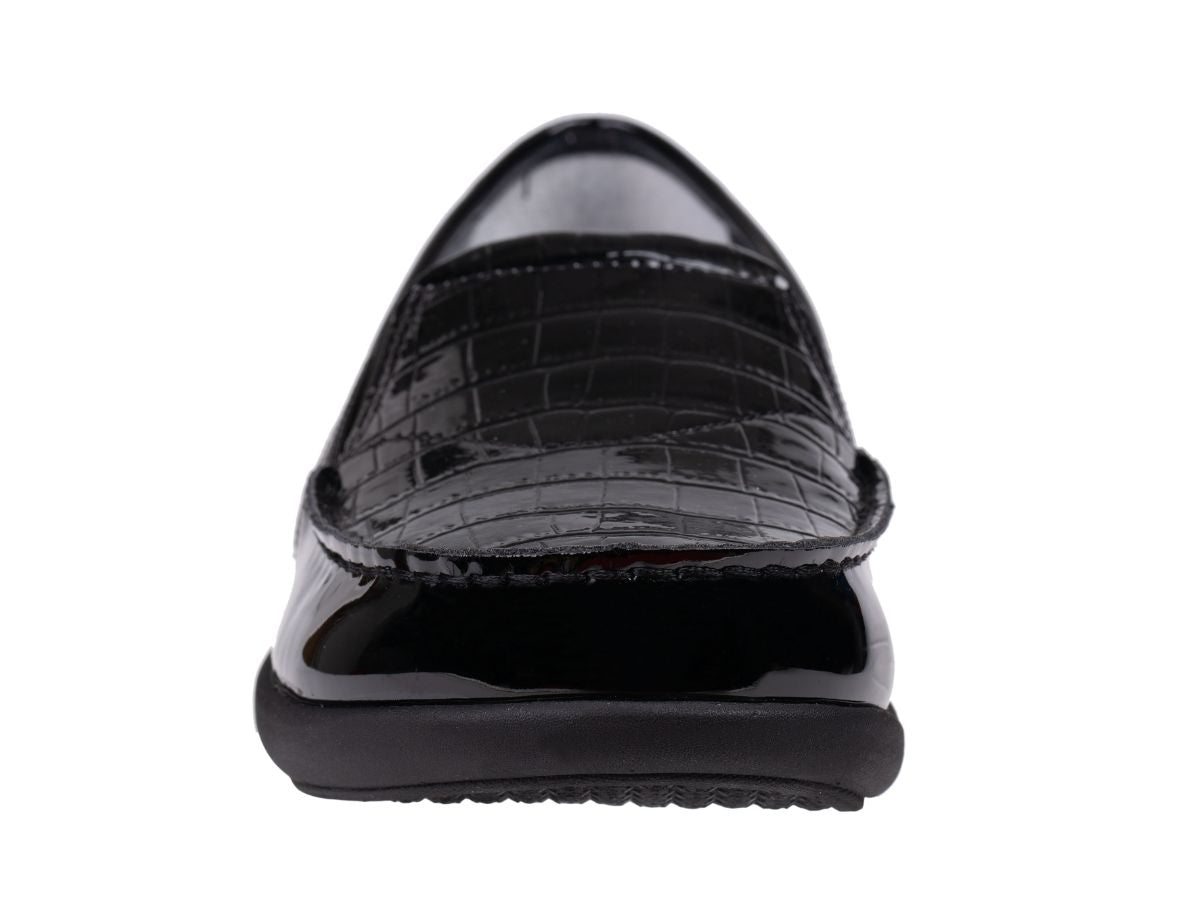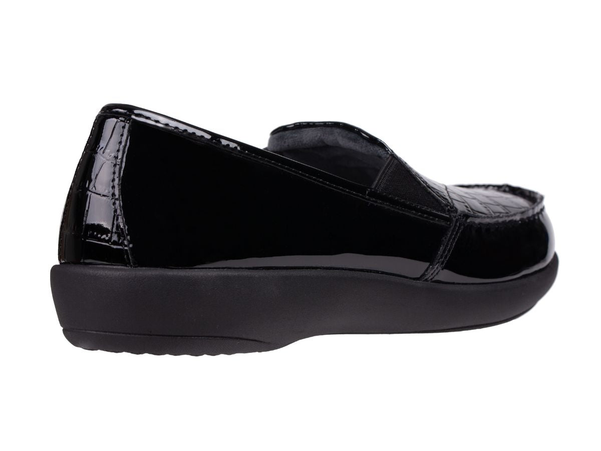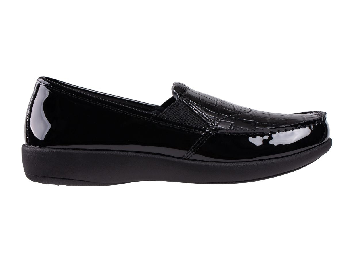 Experience the luxurious embrace of seasonal style with the Siesta Patent Slip-On. This shoe isn't just a slip-on; it's a statement piece that combines rich, deep hues with the subtle texture of croco trim, creating a look that's both elegant and wearable. Feel the gentle give of the stretch gore as you slip them on, and enjoy the confidence of all-day comfort and orthotic support.